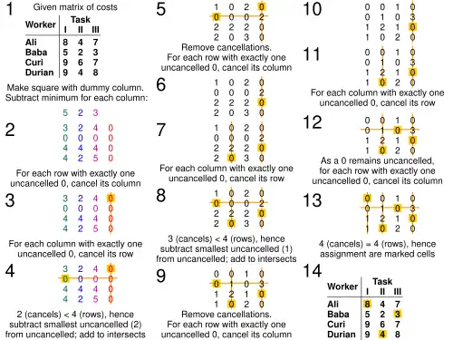 - ↑ Zhu, Haibin; Liu, Dongning; Zhang, Siqin; Zhu, Yu; Teng, Luyao; Teng, Shaohua (2016-03-07). "Solving the Many to Many assignment problem by improving the Kuhn–Munkres algorithm with backtracking". Theoretical Computer Science. 618: 30–41. doi:10.1016/j.tcs.2016.01.002. ISSN 0304-3975.