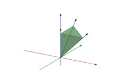 A face of a convex cone is a subset of such that is also a convex cone, and for any vectors in with in , and must both be in .[8] For example, itself is a face of . The origin is a face of if contains no line (so is "strictly convex", or "salient", as defined below). The origin and are sometimes called the trivial faces of . A ray (the set of nonnegative multiples of a nonzero vector) is called an extremal ray if it is a face of .