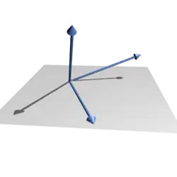- , and are independent because and are independent of each other and is not a linear combination of them or, equivalently, because they do not belong to a common plane. The three vectors define a three-dimensional space.
