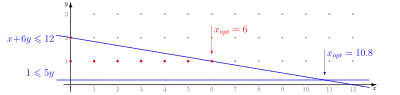 A (general) integer program and its LP-relaxation. The solution set of the former (depicted in red) is strictly smaller than that of the latter (in blue), leading to different optimal solutions.