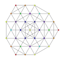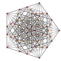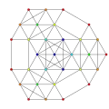 These 71 polytopes are each shown in these 6 symmetry planes, with vertices and edges drawn, and vertices colored by the number of overlapping vertices in each projective position.