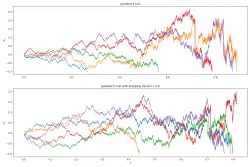 - ↑ For the times before 1 it is a martingale since a stopped Brownian motion is. After the instant 1 it is constant. It remains to check it at the instant 1. By the bounded convergence theorem the expectation at 1 is the limit of the expectation at (n-1)/n (as n tends to infinity), and the latter does not depend on n. The same argument applies to the conditional expectation.