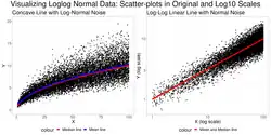 Figure 1 illustrates how this looks. It presents two plots generated using 10,000 simulated points. The left plot, titled 'Concave Line with Log-Normal Noise', displays a scatter plot of the observed data (y) against the independent variable (x). The red line represents the 'Median line', while the blue line is the 'Mean line'. This plot illustrates a dataset with a power-law relationship between the variables, represented by a concave line.