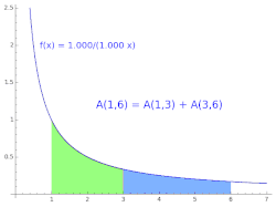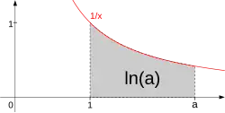 The natural logarithm of a positive, real number a may be defined as the area under the graph of the hyperbola with equation y = 1/x between x = 1 and x = a. This is the integral[4] If a is in , then the region has negative area, and the logarithm is negative.