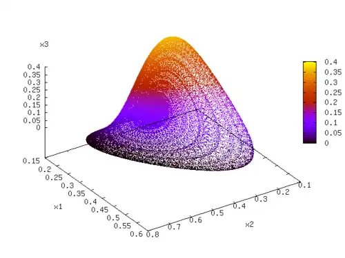 with for all . This system is chaotic and has a largest Lyapunov exponent of 0.0203. From the theorems by Hirsch, it is one of the lowest-dimensional chaotic competitive Lotka–Volterra systems. The Kaplan–Yorke dimension, a measure of the dimensionality of the attractor, is 2.074. This value is not a whole number, indicative of the fractal structure inherent in a strange attractor. The coexisting equilibrium point, the point at which all derivatives are equal to zero but that is not the origin, can be found by inverting the interaction matrix and multiplying by the unit column vector, and is equal to