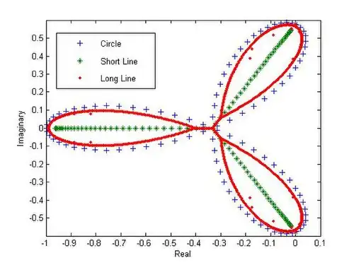 The eigenvalues of the circle system plotted in the complex plane form a trefoil shape. The eigenvalues from a short line form a sideways Y, but those of a long line begin to resemble the trefoil shape of the circle. This could be due to the fact that a long line is indistinguishable from a circle to those species far from the ends.[13]