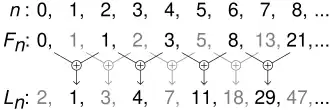 The Lucas sequence has the same recursive relationship as the Fibonacci sequence, where each term is the sum of the two previous terms, but with different starting values.[1] This produces a sequence where the ratios of successive terms approach the golden ratio, and in fact the terms themselves are roundings of integer powers of the golden ratio.[2] The sequence also has a variety of relationships with the Fibonacci numbers, like the fact that adding any two Fibonacci numbers two terms apart in the Fibonacci sequence results in the Lucas number in between.[3]