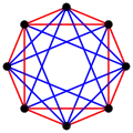 ![]() This graph shows the two alternated polygons as a compound in red and blue 3{3}3 in dual positions. |