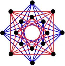 , in 4-dimensional space, sharing the same 8 vertices. The 24 edges in the 16-cell are seen in the Möbius–Kantor polygon when the 8 triangular edges are drawn as 3-separate edges. The triangles are represented 2 sets of 4 red or blue outlines. The B4 projections are given in two different symmetry orientations between the two color sets.