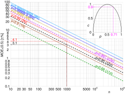 The inset parabola illustrates the relationship between at and at . In the example, MOE95(0.71) ≈ 0.9 × ±3.1% ≈ ±2.8%.