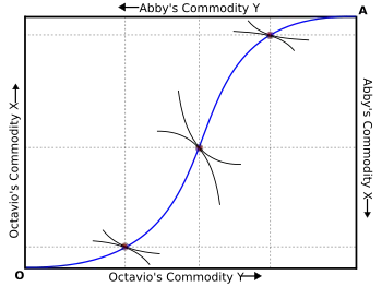 Given two individuals, the set of solutions where both individuals can maximize utility is described by the contract curve on what is now known as an Edgeworth Box. Technically, the construction of the two-person solution to Edgeworth's problem was not developed graphically until 1924 by Arthur Lyon Bowley.[34] The contract curve of the Edgeworth box (or more generally on any set of solutions to Edgeworth's problem for more actors) is referred to as the core of an economy.[35]