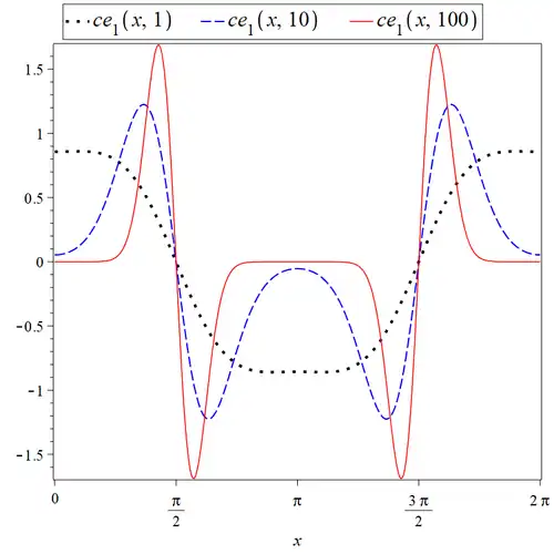 In some usages, Mathieu function refers to solutions of the Mathieu differential equation for arbitrary values of and . When no confusion can arise, other authors use the term to refer specifically to - or -periodic solutions, which exist only for special values of and .[5] More precisely, for given (real) such periodic solutions exist for an infinite number of values of , called characteristic numbers, conventionally indexed as two separate sequences and , for . The corresponding functions are denoted and , respectively. They are sometimes also referred to as cosine-elliptic and sine-elliptic, or Mathieu functions of the first kind.
