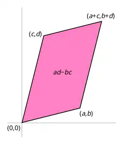 can be viewed as the transform of the unit square into a parallelogram with vertices at (0, 0), (a, b), (a + c, b + d), and (c, d). The parallelogram pictured at the right is obtained by multiplying A with each of the column vectors , and in turn. These vectors define the vertices of the unit square.