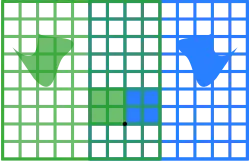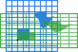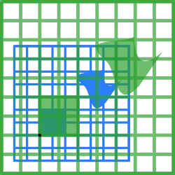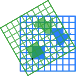 The blue original is mapped to the green grid and shapes. The origin (0, 0) is marked with a black point.