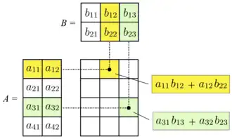 Multiplication of two matrices is defined if and only if the number of columns of the left matrix is the same as the number of rows of the right matrix. If A is an m×n matrix and B is an n×p matrix, then their matrix product AB is the m×p matrix whose entries are given by dot product of the corresponding row of A and the corresponding column of B:[10]