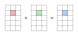 Two matrices must have an equal number of rows and columns to be added.[1] In which case, the sum of two matrices A and B will be a matrix which has the same number of rows and columns as A and B. The sum of A and B, denoted A + B, is computed by adding corresponding elements of A and B:[2][3]