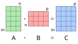 If A is an m × n matrix and B is an n × p matrix, the matrix product C = AB (denoted without multiplication signs or dots) is defined to be the m × p matrix[5][6][7][8] such that for i = 1, ..., m and j = 1, ..., p.
