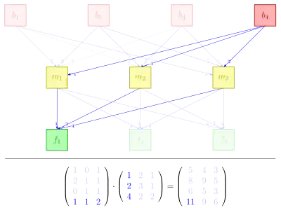 this matrix directly provides the amounts of basic commodities needed for given amounts of final goods. For example, the bottom left entry of is computed as , reflecting that units of are needed to produce one unit of . Indeed, one unit is needed for , one for each of two , and for each of the four units that go into the unit, see picture.