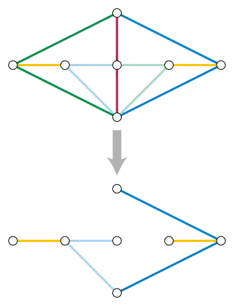 To formulate the problem of finding a Xuong tree as a matroid parity problem, first subdivide each edge of the given graph into a path, with the length of the path equal to the number of other edges incident to . Then, pair the edges of the subdivided graph, so that each pair of incident edges in the original graph is represented by a single pair of edges in the subdivided graph, and each edge in the subdivided graph is paired exactly once. Solve a matroid parity problem with the paired edges of the subdivided graph, using its cographic matroid. This is the dual matroid of a graphic matroid. In it, a subset of edges is independent if its removal does not separate the graph. Any spanning tree of the original graph that avoids the edges used in the matroid parity solution is necessarily a Xuong tree. Each pair selected in the solution can be used to increase the genus of the embedding, so the total genus is the number of selected pairs.[6]