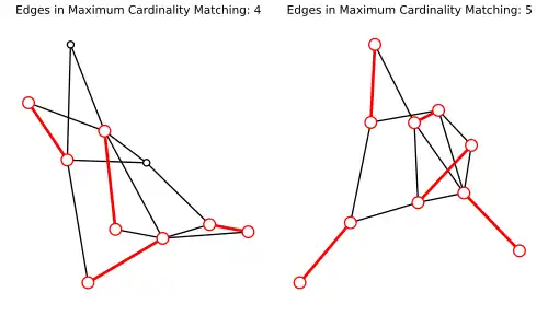 Maximum cardinality matching is a fundamental problem in graph theory.[1] We are given a graph G, and the goal is to find a matching containing as many edges as possible; that is, a maximum cardinality subset of the edges such that each vertex is adjacent to at most one edge of the subset. As each edge will cover exactly two vertices, this problem is equivalent to the task of finding a matching that covers as many vertices as possible.