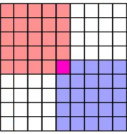 The second observation is that we can use the sorted matrix structure to instantly compare any element to at least half of the entries in the matrix. For example, the median of the row medians across the entire matrix is less than the upper left quadrant in red, but greater than the lower right quadrant in blue: