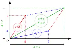 Two points where are two representations of (possibly equivalent) rational numbers and . The line segments connecting the origin of coordinates to and form two adjacent sides in a parallelogram. The vertex of the parallelogram opposite to the origin of coordinates is the point , which is the mediant of and .