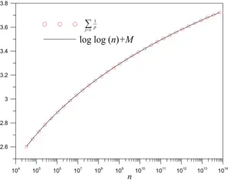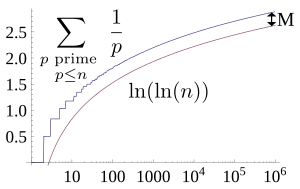 The fact that there are two logarithms (log of a log) in the limit for the Meissel–Mertens constant may be thought of as a consequence of the combination of the prime number theorem and the limit of the Euler–Mascheroni constant.