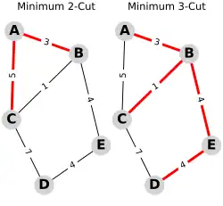 In mathematics, the minimum k-cut is a combinatorial optimization problem that requires finding a set of edges whose removal would partition the graph to at least k connected components. These edges are referred to as k-cut. The goal is to find the minimum-weight k-cut. This partitioning can have applications in VLSI design, data-mining, finite elements and communication in parallel computing.