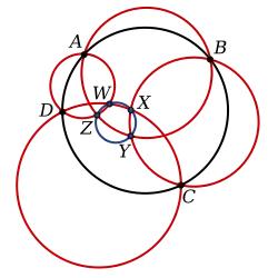 Given points, A, B, C, and D on a circle, and circles passing through each adjacent pair of points, the alternate intersections of these four circles at W, X, Y and Z then lie on a common circle. This is known as the six circles theorem.[10] It is also known as the four circles theorem and while generally attributed to Jakob Steiner the only known published proof was given by Miquel.[11] David G. Wells refers to this as Miquel's theorem.[12]