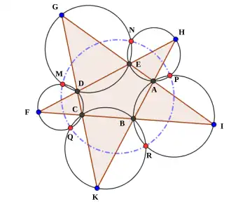 Let ABCDE be a convex pentagon. Extend all sides until they meet in five points F,G,H,I,K and draw the circumcircles of the five triangles CFD, DGE, EHA, AIB and BKC. Then the second intersection points (other than A,B,C,D,E), namely the new points M,N,P,R and Q are concyclic (lie on a circle).[9] See diagram.