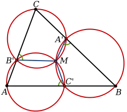The theorem (and its corollary) follow from the properties of cyclic quadrilaterals. Let the circumcircles of A'B'C and AB'C' meet at Then hence BA'MC' is cyclic as desired.
