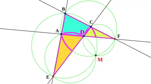 The circumcircles of all four triangles of a complete quadrilateral meet at a point M.[7] In the diagram above these are ∆ABF, ∆CDF, ∆ADE and ∆BCE.