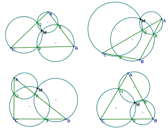Miquel's theorem is a result in geometry, named after Auguste Miquel,[1] concerning the intersection of three circles, each drawn through one vertex of a triangle and two points on its adjacent sides. It is one of several results concerning circles in Euclidean geometry due to Miquel, whose work was published in Liouville's newly founded journal Journal de mathématiques pures et appliquées.