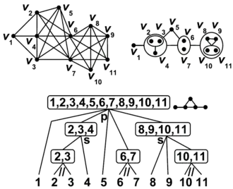 The final tree has one-element sets of vertices of as its leaves, due to the base case. A set of vertices of is a module if and only if it is a node of the tree or a union of children of a series or parallel node. This implicitly gives all modular partitions of . It is in this sense that the modular decomposition tree "subsumes" all other ways of recursively decomposing into quotients.