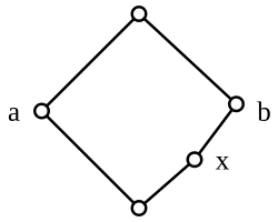 where x, a, b are arbitrary elements in the lattice, ≤ is the partial order, and ∨ and ∧ (called join and meet respectively) are the operations of the lattice. This phrasing emphasizes an interpretation in terms of projection onto the sublattice [a, b], a fact known as the diamond isomorphism theorem.[1] An alternative but equivalent condition stated as an equation (see below) emphasizes that modular lattices form a variety in the sense of universal algebra.