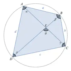 A generalization of Mollweide's formula holds for a cyclic quadrilateral Denote the lengths of sides and and angle measures and If is the point of intersection of the diagonals, denote Then:[5]