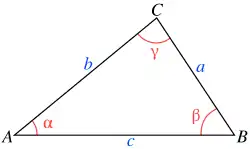 In trigonometry, Mollweide's formula is a pair of relationships between sides and angles in a triangle.[1][2]