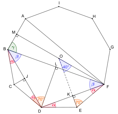 Consider a regular nonagon with side length and let be the midpoint of , the midpoint and the midpoint of . The inner angles of the nonagon equal and furthermore , and (see graphic). Applying the cosinus definition in the right angle triangles , and then yields the proof for Morrie's law:[2]