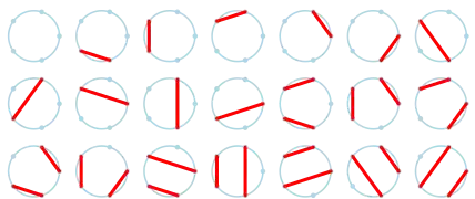 The following figure shows the 21 ways to draw non-intersecting chords between 5 points on a circle (M5 = 21):