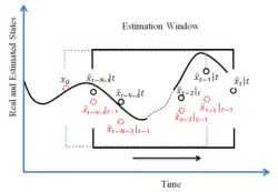 Moving horizon estimation uses a sliding time window. At each sampling time the window moves one step forward. It estimates the states in the window by analyzing the measured output sequence and uses the last estimated state out of the window, as the prior knowledge.