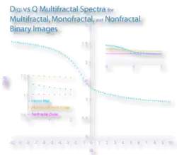 The general pattern of the graph of DQ vs Q can be used to assess the scaling in a pattern. The graph is generally decreasing, sigmoidal around Q=0, where D(Q=0) ≥ D(Q=1) ≥ D(Q=2). As illustrated in the figure, variation in this graphical spectrum can help distinguish patterns. The image shows D(Q) spectra from a multifractal analysis of binary images of non-, mono-, and multi-fractal sets. As is the case in the sample images, non- and mono-fractals tend to have flatter D(Q) spectra than multifractals.