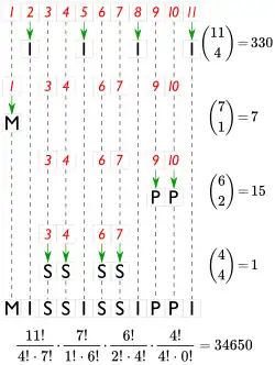 is also the number of distinct ways to permute a multiset of n elements, where ki is the multiplicity of each of the ith element. For example, the number of distinct permutations of the letters of the word MISSISSIPPI, which has 1 M, 4 Is, 4 Ss, and 2 Ps, is