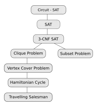 To the right is a diagram of some of the problems and the reductions typically used to prove their NP-completeness. In this diagram, problems are reduced from bottom to top. Note that this diagram is misleading as a description of the mathematical relationship between these problems, as there exists a polynomial-time reduction between any two NP-complete problems; but it indicates where demonstrating this polynomial-time reduction has been easiest.