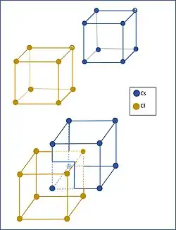 In the unit cell of CsCl, each ion is at the center of a cube of ions of the opposite kind, so the coordination number is eight. The central cation is coordinated to 8 anions on the corners of a cube as shown, and similarly, the central anion is coordinated to 8 cations on the corners of a cube. Alternately, one could view this lattice as a simple cubic structure with a secondary atom in its cubic void.