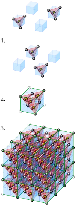 The Zincblende structure (also written "zinc blende") is named after the mineral zincblende (sphalerite), one form of zinc sulfide (β-ZnS). As in the rock-salt structure, the two atom types form two interpenetrating face-centered cubic lattices. However, it differs from rock-salt structure in how the two lattices are positioned relative to one another. The zincblende structure has tetrahedral coordination: Each atom's nearest neighbors consist of four atoms of the opposite type, positioned like the four vertices of a regular tetrahedron. In zinc sulfide the ratio of zinc to sulfur is 1:1.[6] Altogether, the arrangement of atoms in zincblende structure is the same as diamond cubic structure, but with alternating types of atoms at the different lattice sites. The structure can also be described as an FCC lattice of zinc with sulfur atoms occupying half of the tetrahedral voids or vice versa.[6]