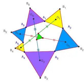 Given a hexagon A1A2A3A4A5A6 with equilateral triangles constructed on the sides, either inwardly or outwardly, and the apexes of the equilateral triangles labelled Bi. If G1, G3, G5 are the respective centroids of △B6B1B2, △B2B3B4, △B4B5B6, then G1, G3, G5 form an equilateral triangle.[23]