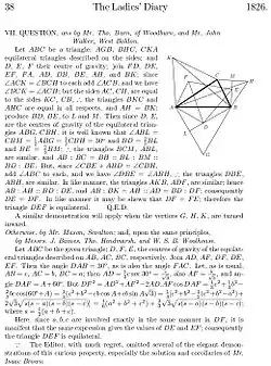 Question 1249 in the Gentleman's Diary; or Mathematical Repository for 1829 (so appearing in late 1828) takes up the theme, with solutions appearing in the issue for the following year. One of the solvers, T. S. Davies then generalized the result in Question 1265 that year, presenting his own solution the following year, drawing on a paper he had already contributed to the Philosophical Magazine in 1826. There are no cross-references in this material to that described above. However, there are several items of cognate interest in the problem pages of the popular almanacs both going back to at least the mid-1750s (Moss) and continuing on to the mid-1860s (Mason), as alluded to above.