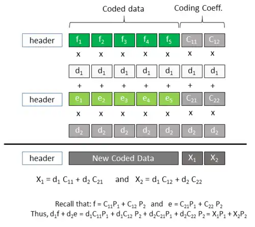 Coding and recoding process in linear network coding. Each packet is seen as a set of elements from a Galois field. Therefore, multiplying and adding two packets means multiplying each of its symbols by a coding coefficient chosen from the Galois field and then adding the two packets together, symbol-wise.