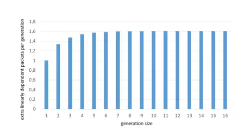 Overhead due to linear dependencies: Since the coding coefficients are chosen randomly in RLNC, there is a chance that some transmitted coded packets are not beneficial to the destination because they are formed using a linearly dependent combination of packets. However, this overhead is negligible in most applications. The linear dependencies depend on the Galois fields' size and are practically independent of the generation size used. We can illustrate this with the following example. Let us assume we are using a Galois field of elements and a generation size of packets. If the destination has not received any coded packet, we say it has degrees of freedom, and then almost any coded packet will be useful and innovative. In fact, only the zero-packet (only zeroes in the coding coefficients) will be non-innovative. The probability of generating the zero-packet is equal to the probability of each of the coding coefficient to be equal to the zero-element of the Galois field. I.e., the probability of a non-innovative packet is of . With each successive innovative transmission, it can be shown that the exponent of the probability of a non innovative packet is reduced by one. When the destination has received innovative packets (i.e., it needs only one more packet to fully decode the data). Then the probability of a non innovative packet is of . We can use this knowledge to calculate the expected number of linearly dependent packets per generation. In the worst-case scenario, when the Galois field used contains only two elements (), the expected number of linearly dependent packets per generation is of 1.6 extra packets. If our generation size if of 32 or 64 packets, this represents an overhead of 5% or 2.5%, respectively. If we use the binary-8 field (), then the expected number of linearly dependent packets per generation is practically zero. Since it is the last packets the major contributor to the overhead due to linear dependencies, there are RLNC-based protocols such as tunable sparse network coding[12] that exploit this knowledge. These protocols introduce sparsity (zero-elements) in the coding coefficients at the beginning of the transmission to reduce the decoding complexity, and reduce the sparsity at the end of the transmission to reduce the overhead due to linear dependencies.