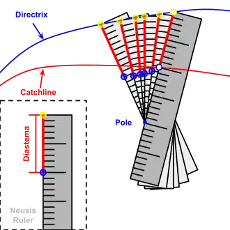 Point P is called the pole of the neusis, line l the directrix, or guiding line, and line m the catch line. Length a is called the diastema (Greek: διάστημα, lit. 'distance').